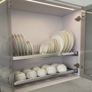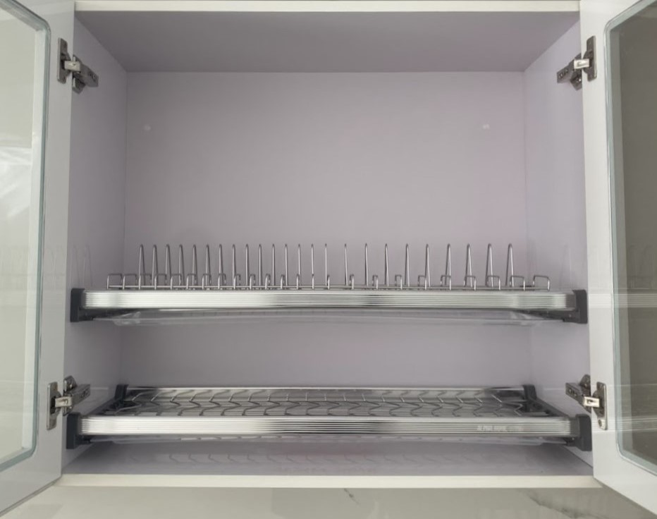 - Lắp đặt: Gắn giá vào khoang tủ bếp trên bằng vít chuyên dụng. Đảm bảo độ chắc chắn và cân đối.