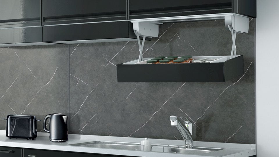 Phụ kiện tủ bếp trên: Giá bát đĩa giúp tổ chức và lưu trữ chén, bát, dĩa một cách gọn gàng và tiện lợi. Tay nâng tủ bếp giúp dễ dàng mở và đóng tủ bếp trên mà không cần dùng nhiều sức.